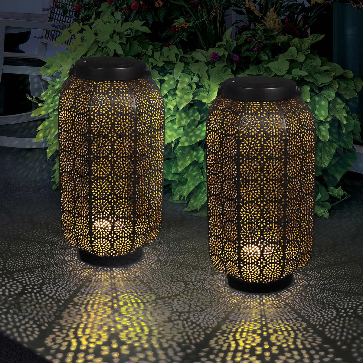 2 lanternes en métal de motifs mandala filigranes, à DEL par énergie solaire